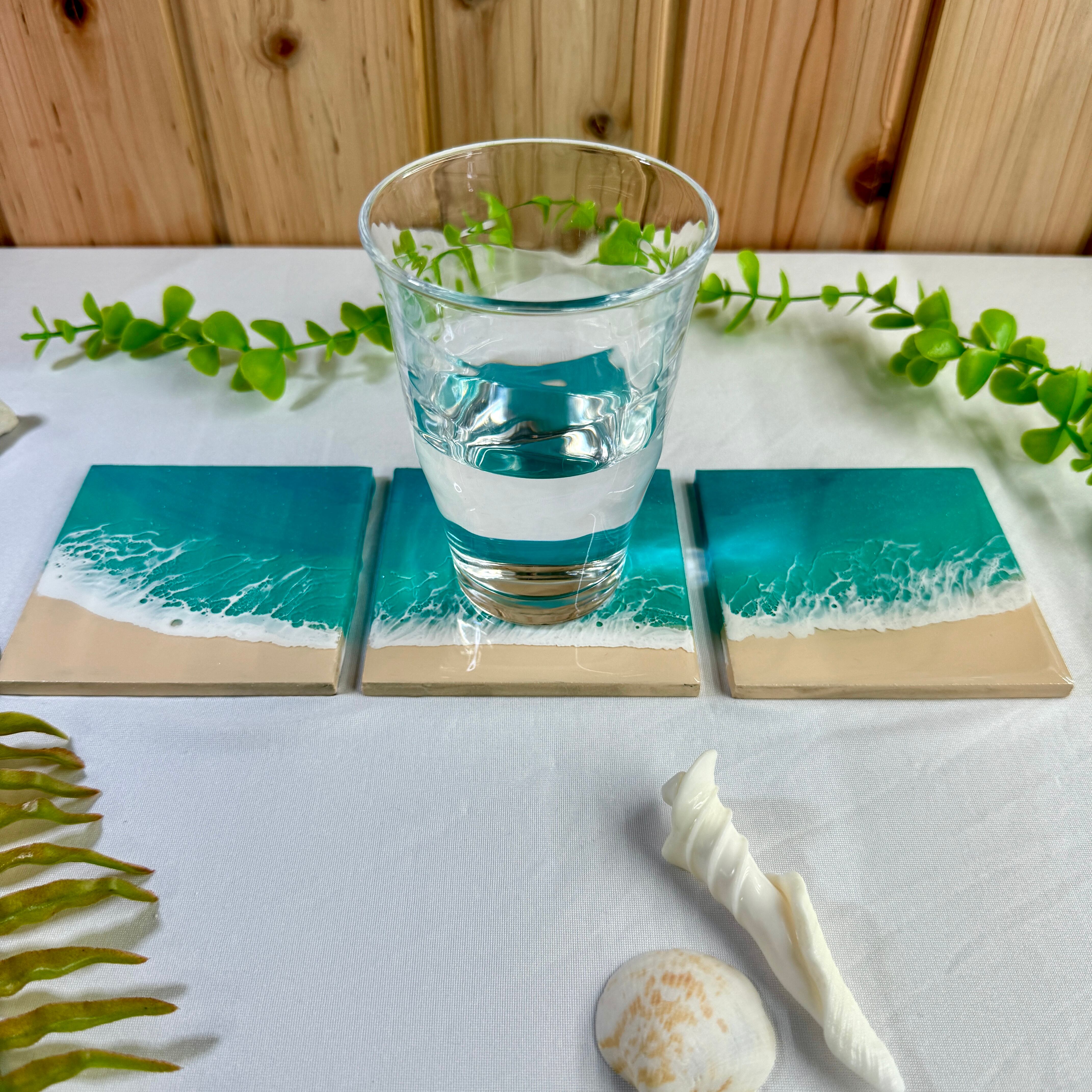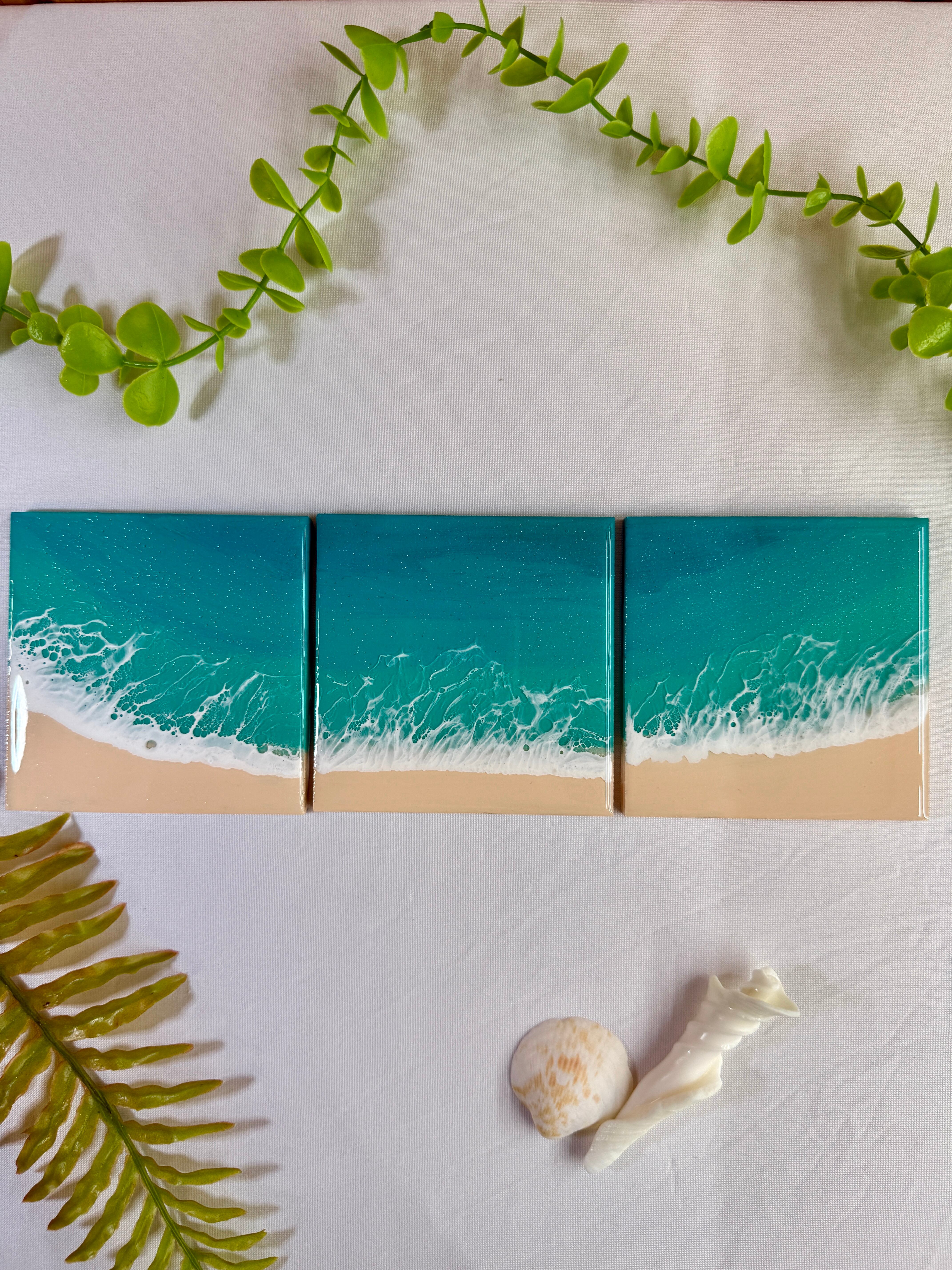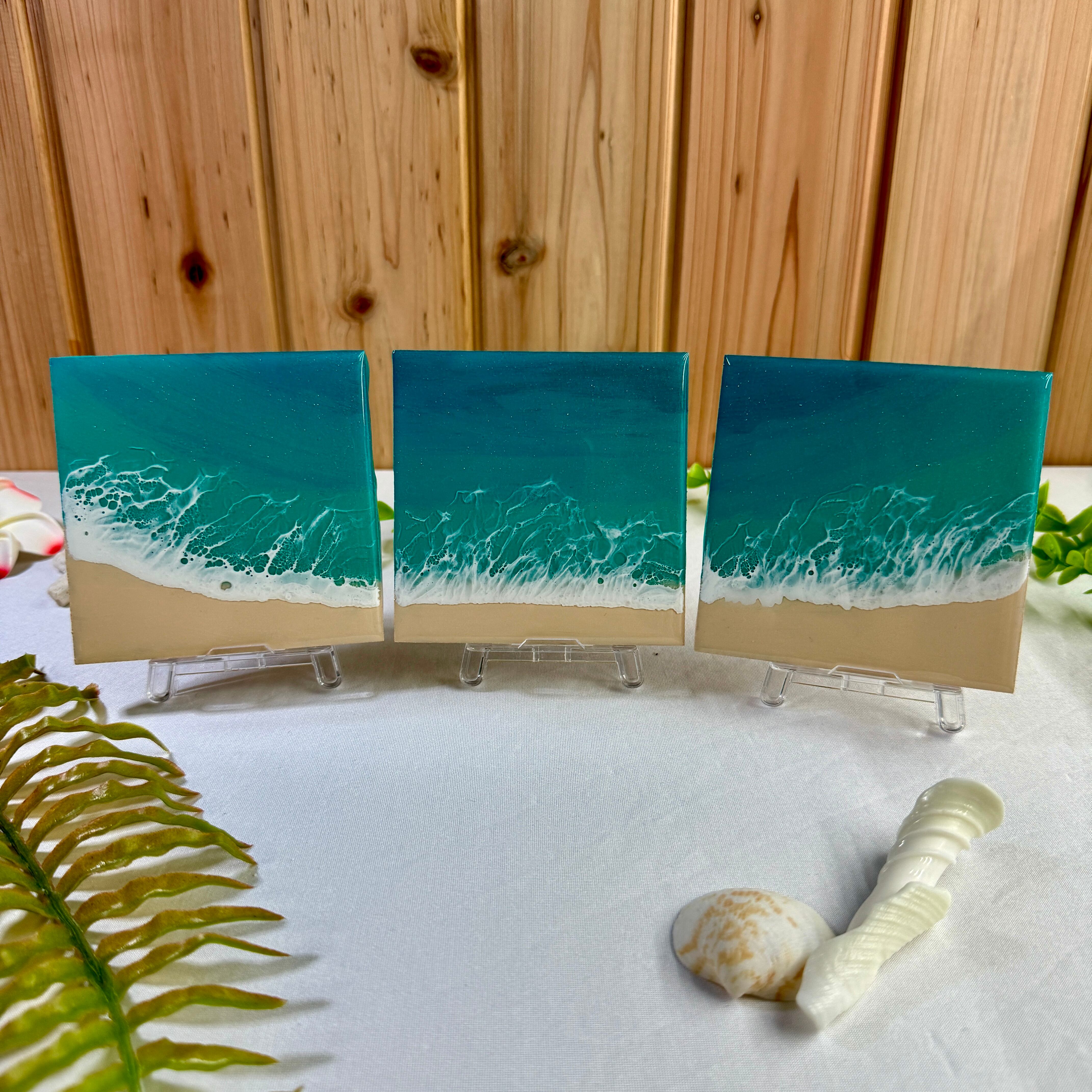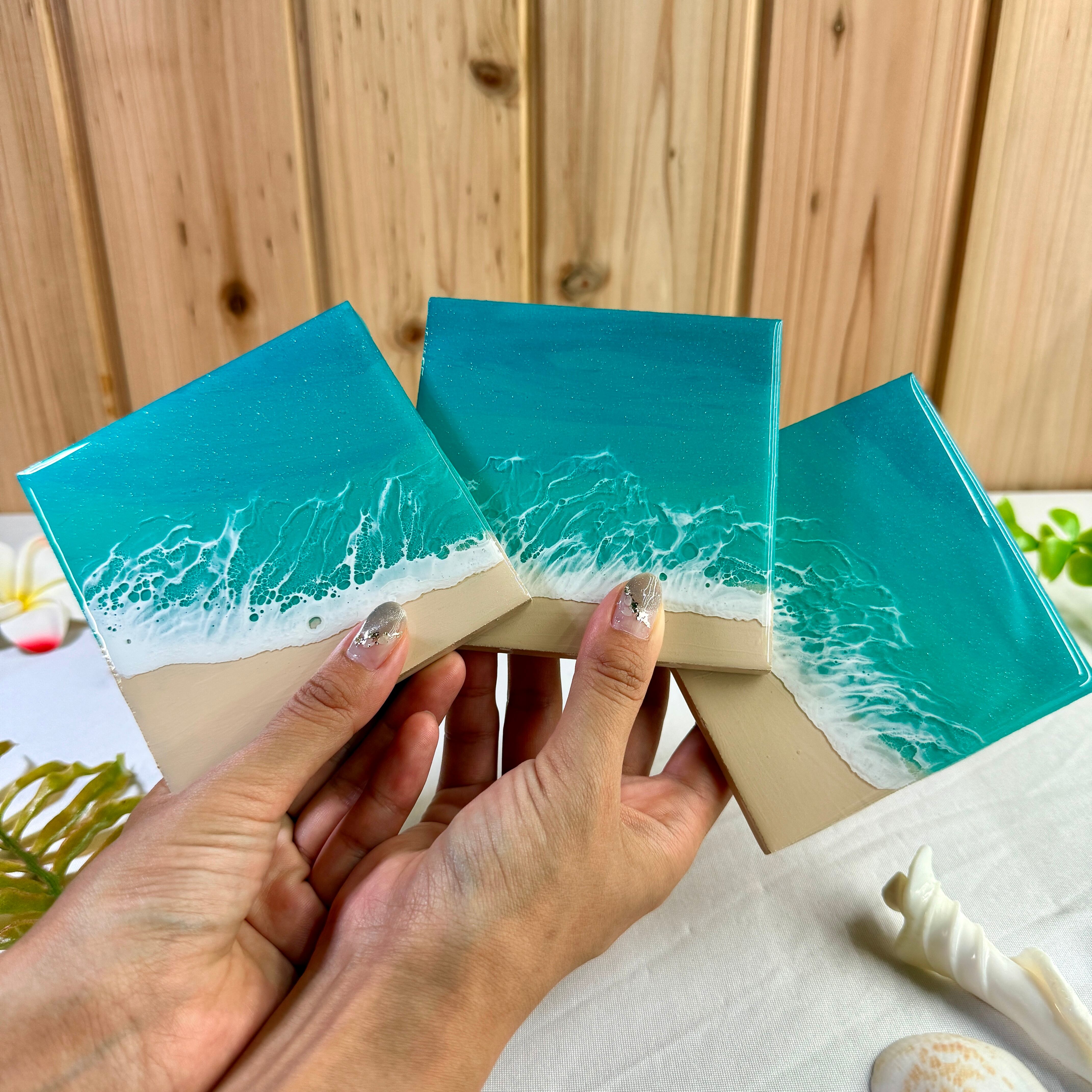 愛知から全国へお届けする、美しい海の輝きを閉じ込めた「海レジンアートコースター 3セット」です。3つのコースターを横に並べると、一つの美しい海の風景が完成します。