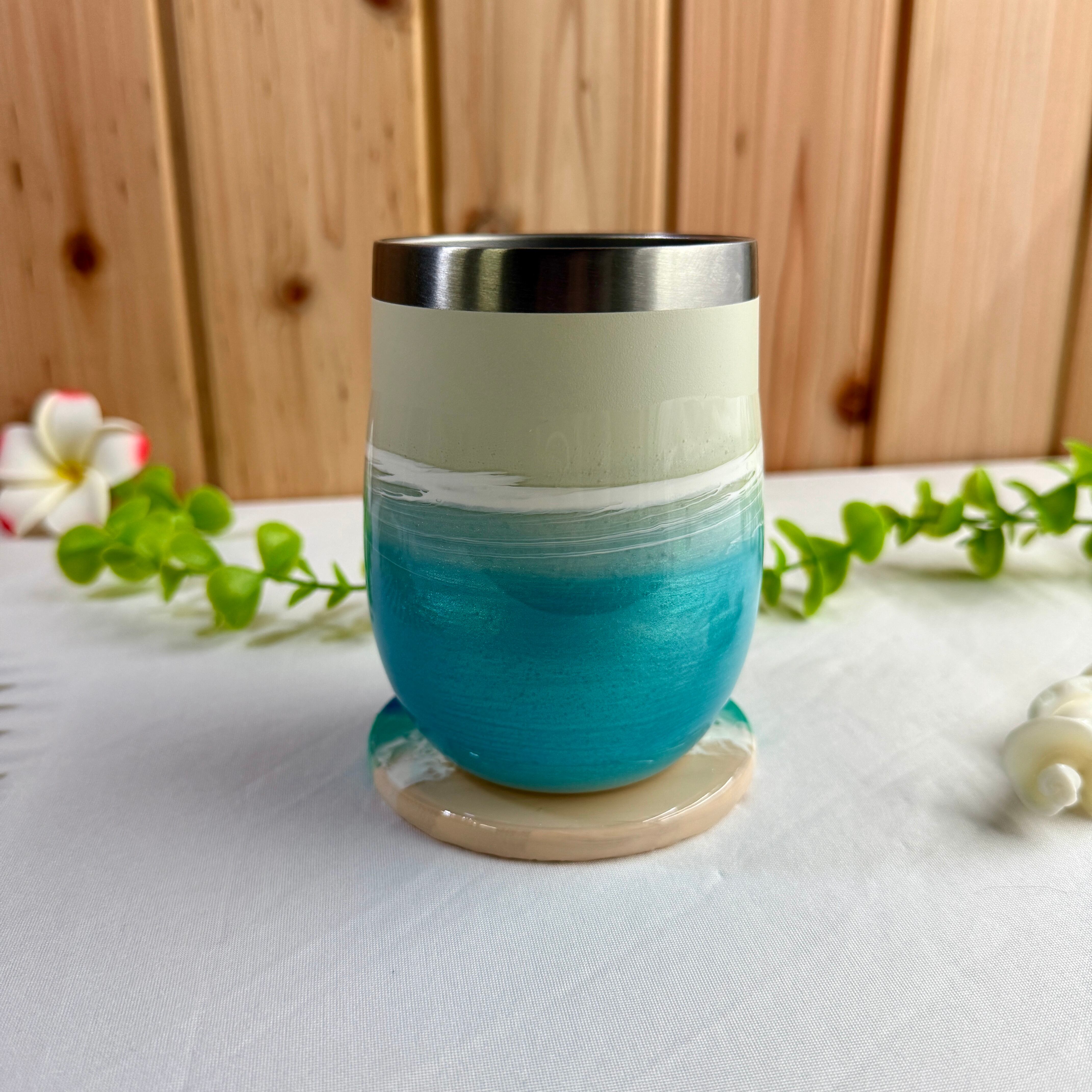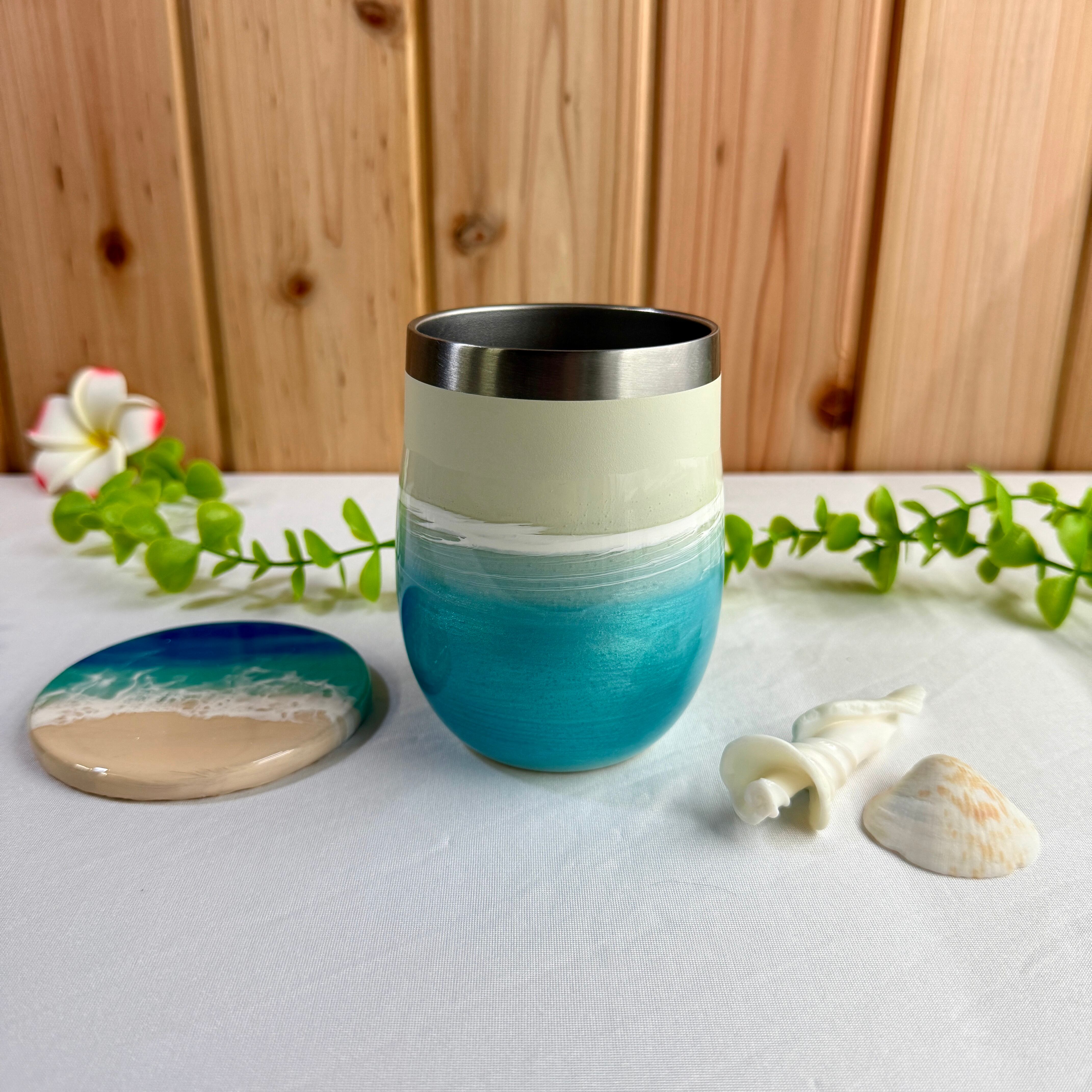 愛知から全国へお届けする、美しい海の輝きを閉じ込めた「海レジンアートタンブラー & コースター」です。統一感のある美しいセットで、ご自宅用はもちろん大切な方への贈り物にも最適です。